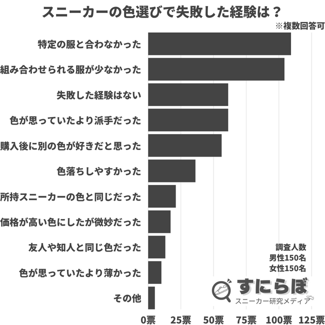 「スニーカーの色選びで失敗した経験は?」という質問に対して、男女から多く票を集めたのは「服との相性」によるものでした。最も失敗と感じる要因は「特定の服と合わなかった」という理由で109票が集まり、最も多い回答となりました。続いて、「組み合わせられる服が少なかった」という理由が104票で2位になりました。「失敗した経験はない」という回答は3位に入りましたが、他にも「購入後に別の色が好きだと思った」という回答もあることから、色の選択に後悔した人は多くいることがわかりました。