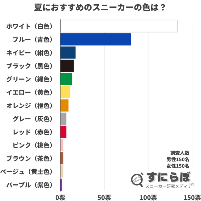 「夏にスニーカーを履く場合、最も合うスニーカーの色はどれだと思いますか?」という質問も行いました。すると、最も人気があるのは、春と同様に「ホワイト」で、男女から133票が入りました。海や空を連想させる「ブルー」は、爽やかな印象で2位となり、同系色の「ネイビー」は3位にランクイン。「ホワイト」と「ブルー」は男女問わず多くの支持を受けましたが、「ブラック」や「グリーン」では、男性の票数の方がやや多い結果となりました。