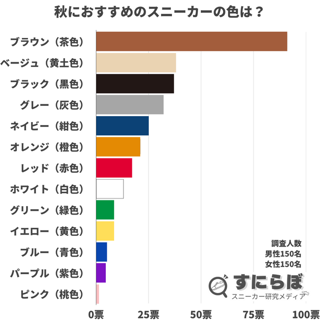 「秋にスニーカーを履く場合、最も合うスニーカーの色はどれだと思いますか?」質問に対し、最も支持を集めた色は「ブラウン」。他の色よりも大きく差をつけました。「ブラウン」と「ベージュ」は秋の季節をイメージする色であるため、それぞれ多くの支持を集めました。これらの2色は秋の風景や自然の色合いにマッチし、落ち着いた雰囲気と温かみを感じさせます。また、「ブラック」はシンプルでクラシックな色なので、秋にも人気があるようです。