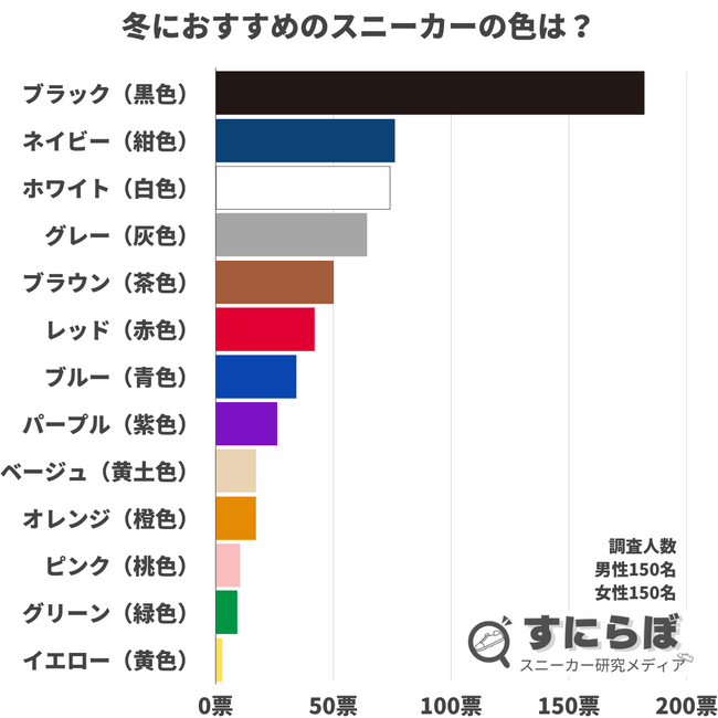 「冬にスニーカーを履く場合、最も合うスニーカーの色はどれだと思いますか?」という質問では、男女総合で158票を獲得した「ブラック」が最も多くの支持を集めました。「ブラック」は男性の投票でも76票で最も高く、女性の投票でも82票でトップでした。続いては、冬の季節に合う落ち着いた色である「ネイビー」が31票を得て2位にランクイン。暗い色が多く選ばれてる中、明るさと清潔感が出せる「ホワイト」は30票を獲得して3位に入りました。