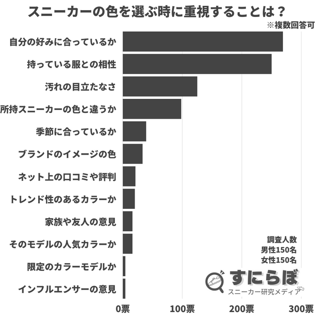 「スニーカーの色を選ぶ時に重視することは?」という質問に対して、多くの票を得たのは「自分の好みに合っているか」と「持っている服との相性」の2項目でした。最も多くの票を獲得したのは「自分の好みに合っているか」であり、男女300名中269票の回答を得ました。人々が自分の個性を大事にしていることがわかります。次に多かったのが「持っている服との相性」です。この項目は男性と女性で少し票数に差がありますが、服装とスニーカーの組み合わせは、オシャレなルックスを作る上で両性ともに重要な要素と言えます。