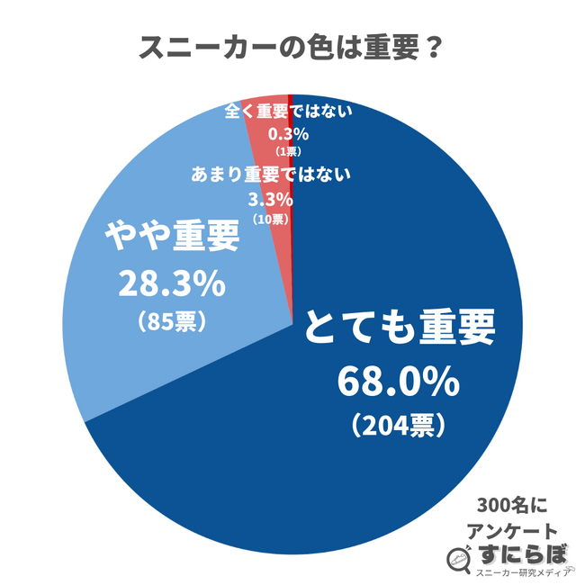 男女300名のアンケート結果から、多くの人がスニーカーの色を重要視していることがわかりました。アンケート結果をみると、参加した方々の68.0%が「とても重要」と回答し、さらに28.3%が「やや重要」と答えました。合計で95%以上の方が、スニーカーの色は「重要」と回答しています。