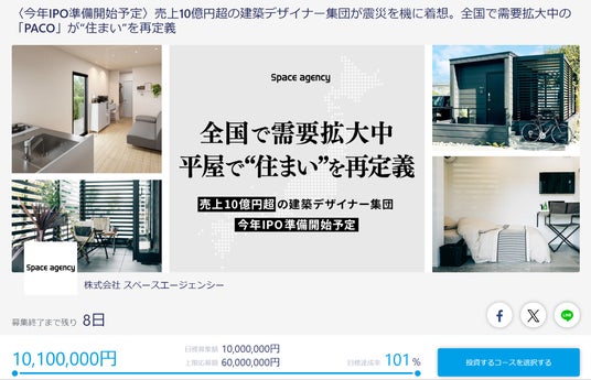 住空間・商空間の新築、リフォーム設計施工を事業とする株式会社スペースエージェンシー (熊本市中央区 代表取締役:益田 健至)は、株式投資型クラウドファンディングサービス「FUNDINNO(ファンディーノ)」において、2024年3月5日(火)の19:30より、募集による投資申込みの受付を開始し、2024年3月6日(水)の14:59に目標募集額の1,000万円のお申込みを達成いたしましたこと、お知らせ申し上げます。