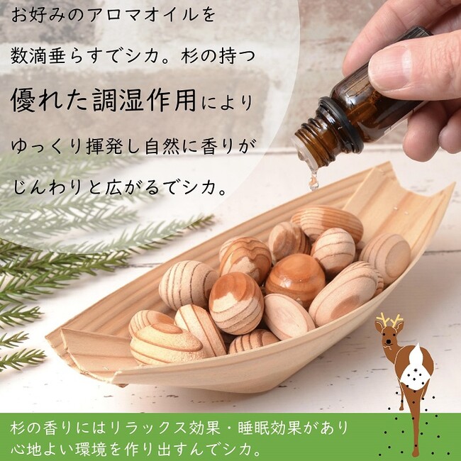 本商品は、吉野ヒノキと並び、奈良の木のブランド木材である吉野スギの端材を有効活用。杉の優れた調湿効果、そして、リラックス効果・睡眠効果などに着目して商品開発に取り組みました。お客さまご自身が杉の薄板で舟(器)を作り、そこに杉玉を入れて、お好みのアロマオイルを垂らして香りを楽しむアロマディフューザー(手作りキット)となっております。