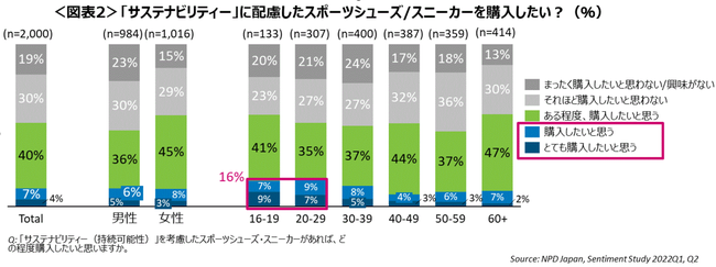 2022年7月実施の民間調査によると、日本でサステナビリティーに配慮したスポーツシューズ・スニーカーを「購入したい/とても購入したい」と答えた消費者は全体の11%で、若年層ではこの割合が16%でした。最も多かったのは「ある程度は購入したいと思う」という消極的支持層で、全体の40%でした(NPD Japan, エヌピーディー・ジャパン調べ)。
