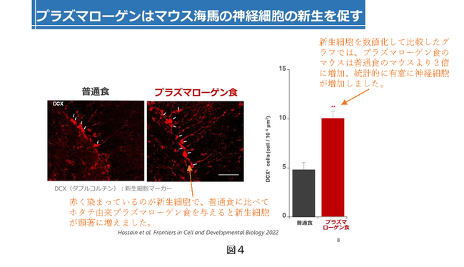 3. ホタテ由来プラズマローゲンは、マウス海馬の新生ニューロンの数が増加(図4)することが分かりました(神経細胞の新生)。