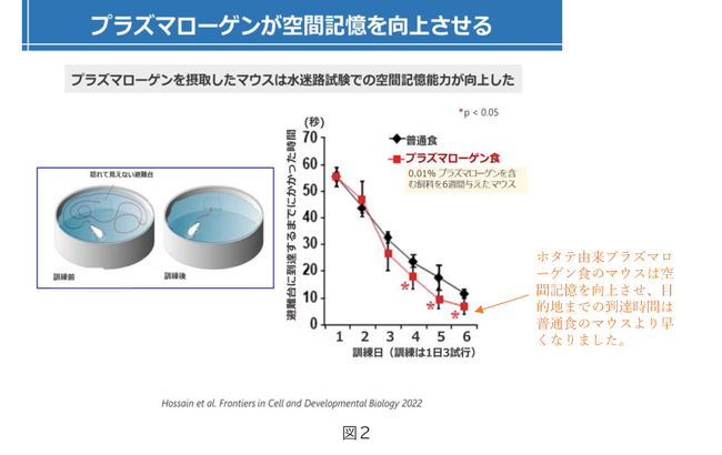 ◆ レオロジー機能食品研究所(藤野武彦代表、馬渡志郎所長、Shamim Hossain基礎研究部長)の研究グループは、ホタテ由来プラズマローゲンが記憶・学習能力を高める事とそのメカニズムを明らかにしました。