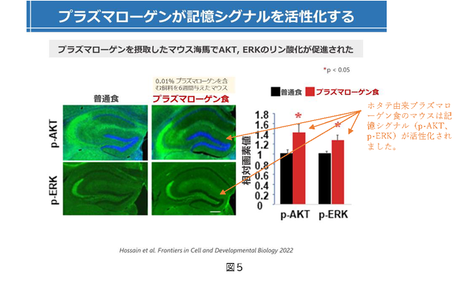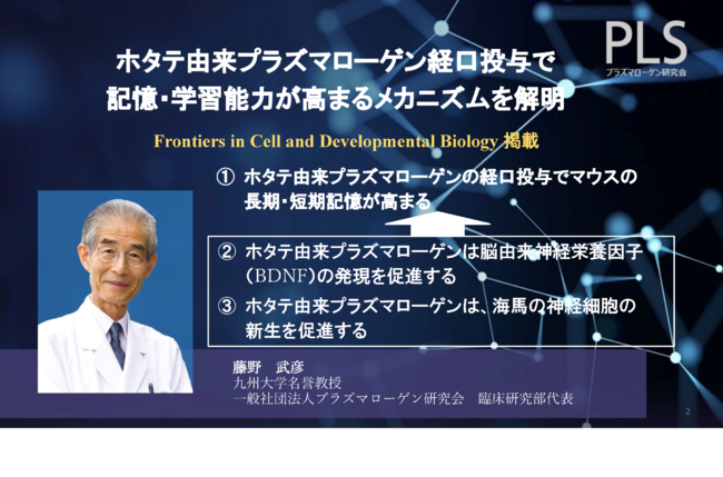 現在アミロイドβ仮説によるアルツハイマー病の多数の新薬の開発が行われましたが成功していません。今回の論文でホタテ由来プラズマローゲンと記憶・学習力向上のメカニズムが明らかにされてきましたので、認知機能低下の新たな予防及び治療に向けた創薬への取り組みが期待されます。