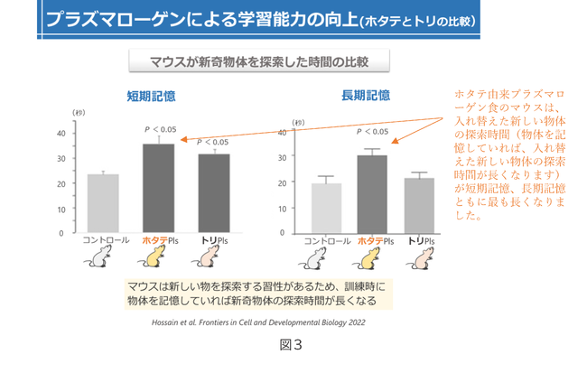 2. ホタテ由来プラズマローゲンをマウスに経口投与すると海馬のプラズマローゲンが増加(図1)し、記憶力・学習能力が高まりました(図2・図3)。