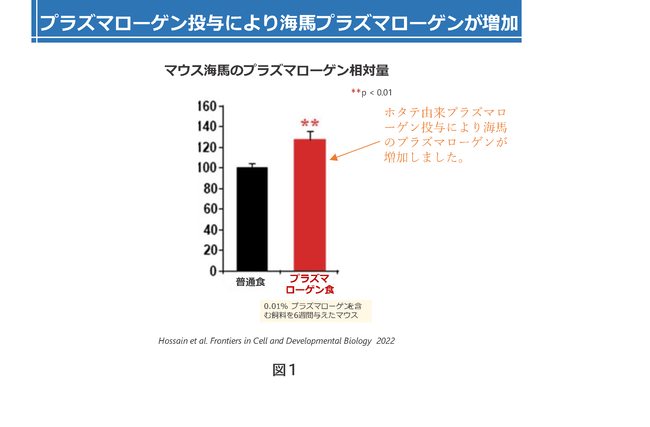 今回の研究成果は、脳内プラズマローゲンが海馬の神経細胞を活性化し、記憶力を高めることを示しています。プラズマローゲンは、アルツハイマー病患者の脳で減少していることが知られており、これまでヒト臨床試験で軽度認知障害(MCI)、軽度アルツハイマー病(AD)、中等度AD、重度AD患者でホタテ由来プラズマローゲンを摂取することで改善および現状維持が見られています。今回の論文はアルツハイマー病患者の脳におけるプラズマローゲンの減少は、記憶力低下の危険因子の一つであると考えられ、プラズマローゲンの摂取により記憶が改善する可能性がある事を裏付ける根拠となるものです。