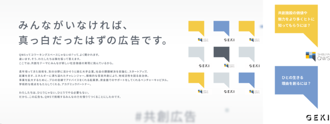 株式会社GEKI(以下、GEKI)は「渋谷スクランブルスクエア」15階に位置する共創施設「SHIBUYA QWS(渋谷キューズ/以下、QWS)」(本社:東京都渋谷区、運営会社:渋谷スクランブルスクエア株式会社)で活動する総勢123団体と共同で作成した共創広告を2023年3月20日(月)~3月26日(日)に掲出することをお知らせいたします
