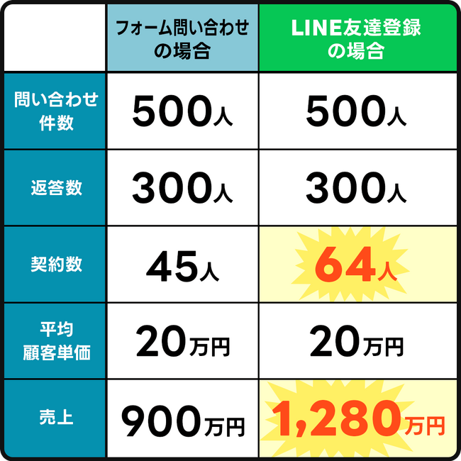 LINE友達登録に対する返答率は、フォーム登録に対する返答率と比べて140%増になり、見込みユーザーのリスト化に成功している事例が多数出ております。