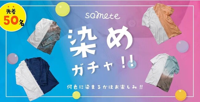 お手持ちの白いお洋服やsometeオリジナルTシャツ「someT」を、ガチャを購入いただき出た色(タイダイ、漆黒、藍色など)に染め直して、後日お渡しするキャンペーンです。