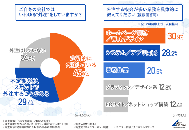 「ご自身の会社ではいわゆる“外注”をしていますか?」と質問したところ、7割以上の方が『定期的に外注している(45.7%)』『不定期だが、スポットで外注することがある(29.4%)』と回答しました。