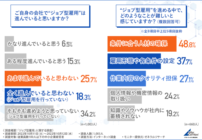 アフターコールナビ株式会社(本社所在地:東京都江東区)は、全国の中小企業経営者の方を対象に「ジョブ型雇用」に関する調査を実施しました。