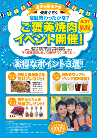 宿題を終わらせて、おいしい焼肉とドリンク、ヴィレッジヴァンガードで人気のおもちゃをもらおう!
