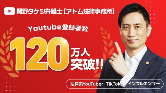 弁護士YouTuber岡野武志の運営するYouTubeチャンネル『岡野タケシ弁護士【アトム法律事務所】』について、2022年10月8日、チャンネル登録者数が120万人を突破しました。