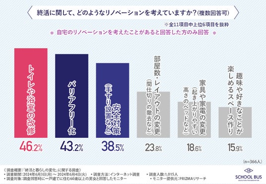 「終活に関して、どのようなリノベーションを考えていますか?(複数回答可)」と質問したところ、『トイレや浴室の改修(46.2%)』と回答した方が最も多く、次いで『バリアフリー化(43.2%)』『安全対策(手すり設置など)(38.5%)』と続きました。