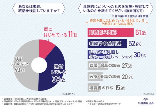 スクールバス空間設計株式会社(本社所在地:大阪府大阪市、代表者:田中 将司)は一戸建てに住む60歳以上の男女1,015人を対象に「終活と暮らしの変化」に関する調査を実施しました。