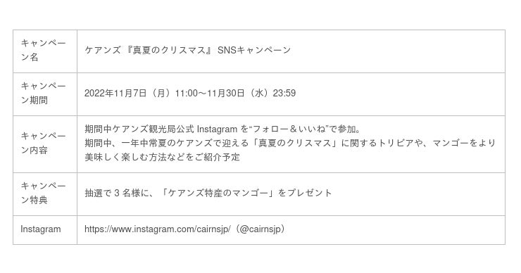 ケアンズ観光局(オーストラリア クイーンズランド州ケアンズ、CEO:マーク オルセン)は、11月7日(月)から11月30日(水)までの約3週間、ケアンズ 『真夏のクリスマス』 キャンペーンをInstagram限定で実施いたします。キャンペーン期間中に、日本では体験したことのない一年中常夏のケアンズだからこそ味わえるクリスマス情報をSNSを通して発信していきます。