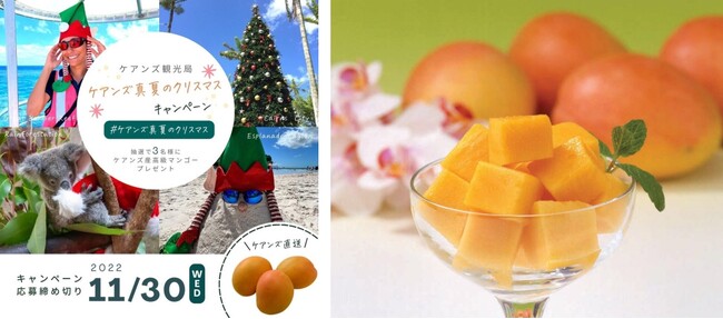 ケアンズ 『真夏のクリスマス』 キャンペーンでは、期間中にケアンズ観光局の公式Instagramを“フォロー&いいね”するだけで、抽選で 3 名様に真夏を象徴するトロピカルフルーツ「ケアンズ特産のマンゴー」が当たります。また、キャンペーン期間中にはInstagramで、一年中常夏のケアンズで迎える「真夏のクリスマス」に関するトリビアや、マンゴーをより美味しく楽しむ方法などをご紹介します。