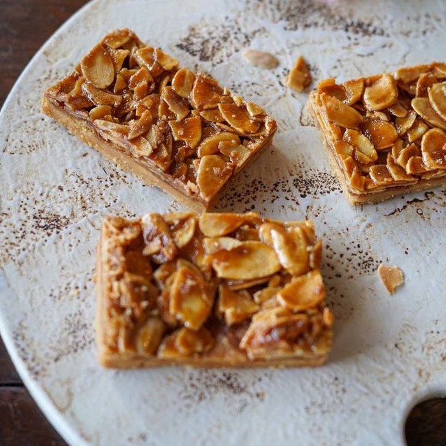 スライスアーモンドを黒糖でキャラメリゼしタルト生地と合わせて焼き上げた香ばしいお菓子。