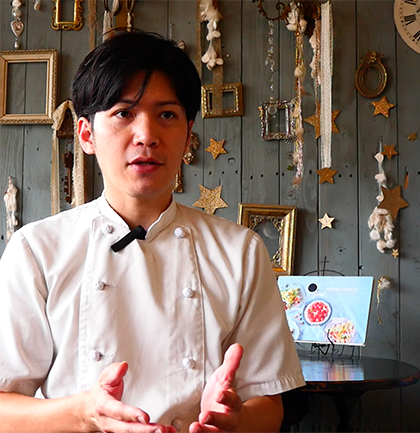 今回お菓子作りをして頂いた比嘉司さんは県内外からファンが通う隠れ家カフェO’CREPEでオーナーパティシエをされています。O’CREPEは旬のフルーツを使用したクレープや、シェフのオリジナリティ溢れる様々なクレープを楽しめるカフェです。比嘉さんはクレープだけではなく、フランス菓子にも造詣が深いパティシエ。黒糖のイメージを変える新しいお菓子を作りたいと、うれしな便スタッフと一緒に本当に試行錯誤してくださいました。