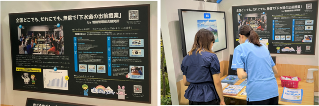 ・下水道の出前事業:楽しみながら下水道について学んでもらうために全国各地へ無償で行っていることをパネルと映像で掲示。