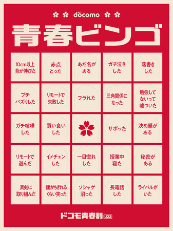 ドコモが贈る「⻘春ビンゴ」をもっと高校生・大学生が参加できるものにという想いから、Web上でも自分の好きな青春ビンゴを遊べる「青春ビンゴメーカー」を制作しました。10種類のジャンルから遊びたいビンゴのジャンルを選ぶと、青春あるあるが詰まったビンゴが生成されるジェネレーターとなっています。「恋愛あるある」「運動部あるある」「放課後あるある」など、さまざまな青春の場面を振り返ることができます。ダウンロードして友達と学生時代の思い出やつながりを振り返りながら、ぜひ思い出の写真と一緒にSNSでシェアしてください。