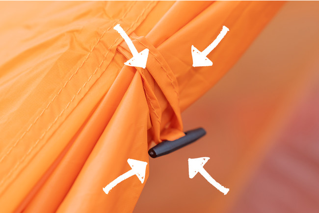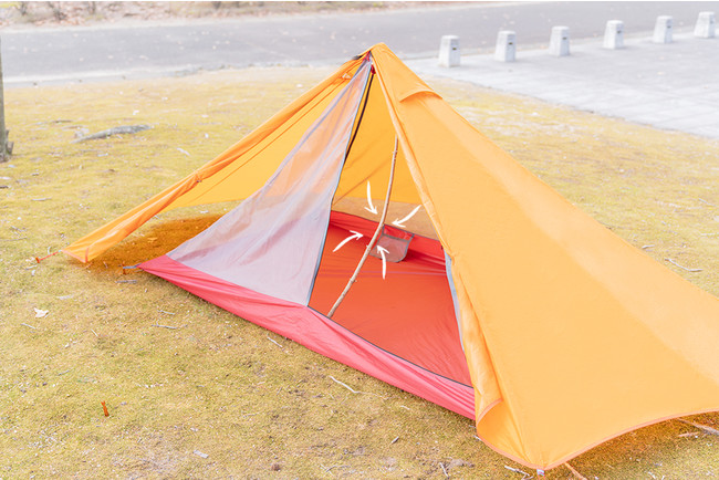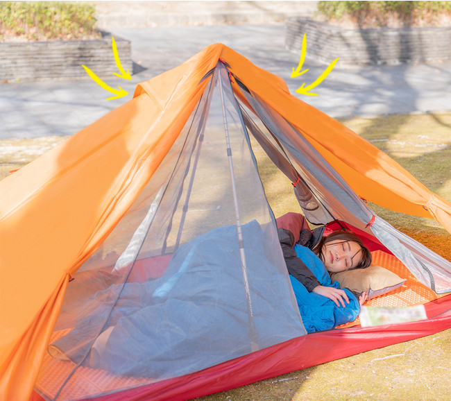 フライシートはナイロンの裏面にシリコンを染み込ませたシルナイロン生地、着替えや睡眠とプライバシーを守り、雨の侵入を防げ、テント内を快適に過ごせます。