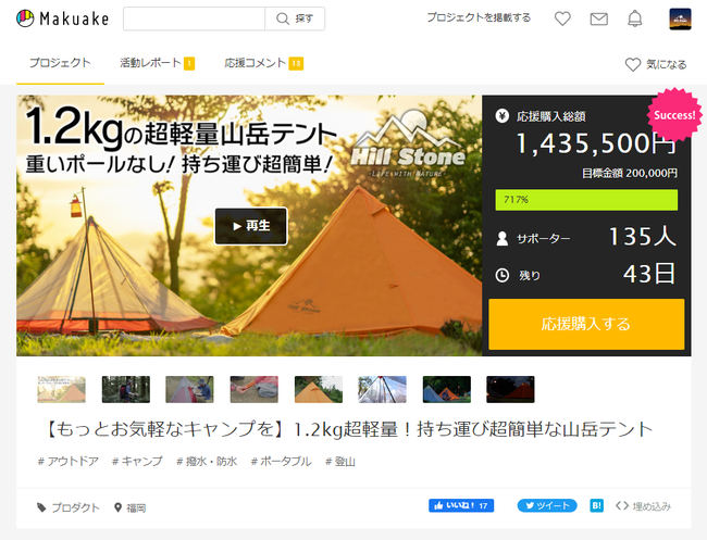 錦商事株式会社(本社:福岡県福岡市、代表取締役:卞 慧)は応援購入サービスMakuake(マクアケ)にて、2022年7月25日(月)~9月10日(土)の期間限定で、「超軽量山岳テント」の先行予約販売を開始しました。(Makuakeプロジェクトページ:https://www.makuake.com/project/hill_stone/)\早割受付中/