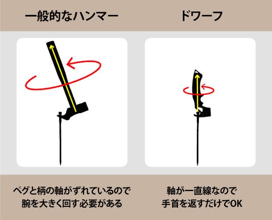 それに対し、ドワーフはフックがほぼ中央(木柄の延長線上)にあるため、ハンマーとペグの回転軸が一直線に揃い、軽い力で小さく手首を返すだけでペグを引き抜くことが出来ます。
