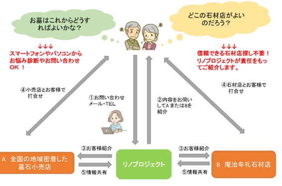 わたしたちはお客様が安心してお任せできる永年地域に定着して経営されてこられた石屋さんと石屋さんを繋いで、全国の石材ネットワークを構築しています。そういった石屋さんがお客様のお困りごとに対応します。また、お引越しの際に、お客様の想いやその土地に合わせて「お墓」を作り変えたり、元のお墓を新しいお墓の一部に使用する(いわゆるリノベーション)ことで、より安心に身近に供養できるお手伝いをさせていただきます。