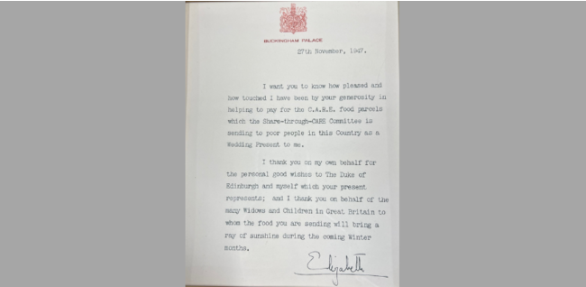 エリザベス二世女王陛下が「一筋の太陽の光」と表した「CAREパッケージ」から始まった国際協力NGOは、1947年に女王陛下から送られた感謝状を公開