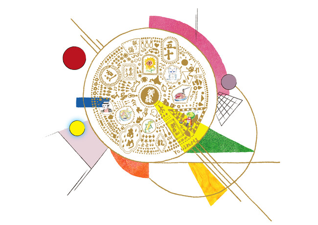 今回の企画のためだけに大泉がいくつもの絵や書を描き、それらを森本さんがコラージュ的にデザインした「大泉フィフティー曼荼羅」。「御縁」「五十」「道」「ありがとう」「あめ」「バカ」「振り幅」といった大泉の書や、「カブに乗る後ろ姿」「ドームパスタ」「子猫」「真池龍」などのイラストが隠れています。