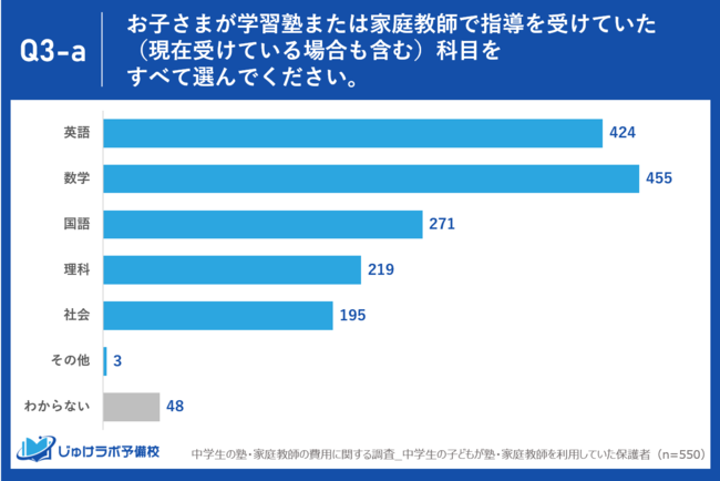 Q3「お子さまが学習塾または家庭教師で指導を受けていた(現在受けている場合も含む)科目をすべて選んでください。」(n=550)と質問したところ、「数学」と回答した人が455人、「英語」と回答した人が424人、「国語」と回答した人が424人という結果になりました。