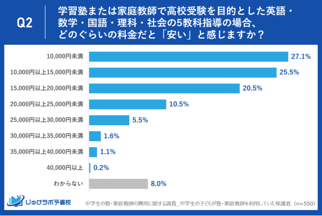Q2「学習塾または家庭教師で高校受験を目的とした英語・数学・国語・理科・社会の5教科指導の場合、どのぐらいの料金だと「安い」と感じますか?」(n=550)と質問したところ、「10,000円未満」と回答した人が27.1%、「10,000円以上15,000円未満」と回答した人が25.5%、「15,000円以上20,000円未満」で、20,000円未満に7割以上が占める結果になりました。