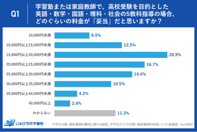Q1「学習塾または家庭教師で、高校受験を目的とした英語・数学・国語・理科・社会の5教科指導の場合、どのぐらいの料金が妥当だと思いますか?」(n=550)の質問に対し、「15,000円以上20,000円未満」と回答した人が20.9%、「20,000円以上25,000円未満」と回答した人が16.7%、「25,000円以上30,000円未満」と回答した人が14.4%という結果になりました。