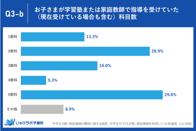 Q3のアンケート結果を科目数で集計したところ、「5教科」が29.6%、「2教科」が26.9%、「2教科」が16.0%という結果になりました。