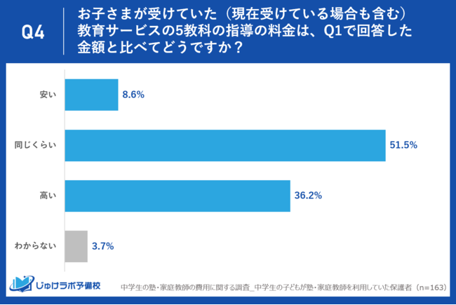 Q3で「英語」「数学」「国語」「理科」「社会」のすべてを選択した人に対し、Q4「お子さまが受けていた(現在受けている場合も含む)教育サービスの5教科の指導の料金は、Q1で回答した金額と比べてどうですか?」(n=163)と質問したところ、「同じくらい」と回答した人が51.5%、「高い」と回答した人が36.2%、「安い」と回答した人が8.6%という結果になりました。