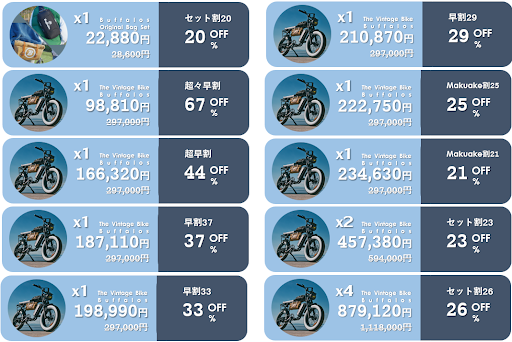 Authentec Vintage Bike『Buffalos』の発売を記念して、通常セット総額297,000円(税込)を、67%オフの破格の98,810円(税込)からご提供いたします。