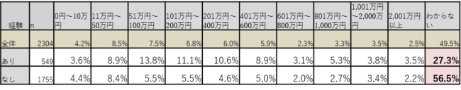 経験有無別の「わからない」の回答率は、「なし」の人の56.5%に対し、「あり」の人は27.3%にとどまり、必要金額の理解度に差があることがわかる。