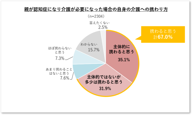 親が認知症で介護が必要になった場合、7割弱が介護に携わる意向ありと回答。
