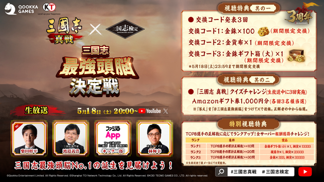 また、視聴者向けの『三國志 真戦』クイズも実施されます。「答え」を「#三国志最強頭脳」をつけてXで投稿。毎回正解者の中から抽選で3名様にAmazonギフト券1,000円分を贈呈します。