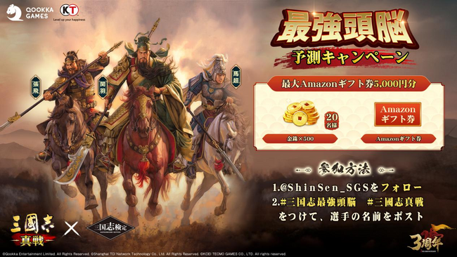 Qookka Entertainment Limitedが株式会社コーエーテクモゲームスの歴史シミュレーションゲーム『三國志13』のIPを使用し、同社監修の元で開発されたスマートフォン向けゲームアプリ『三國志 真戦』、同ゲームが5月19日にリリース3周年を迎えるにあたり、特別限定イベント『三國志 真戦』x 三国志検定 SP版「三国志最強頭脳決定戦」を開催!