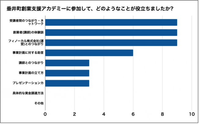 全10回のプログラム終了後、受講者に対しアンケート調査を実施し、最終報告会に参加した計15名から回答を得ました。結果、本アカデミーが自身の新規創業・第二創業に向けて「学びとなった」と93%が回答し、また26%の方がアカデミーを受講したことにより、創業に向けた準備状況が進展したと回答を得ることができました。アカデミーを通じて役立った内容としては、講師・受講者・運営者との繋がりが上位回答に挙がりました。