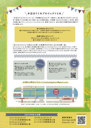 水辺はぐくみプロジェクトとは「水辺はぐくみプロジェクト」は、“天満橋&はちけんや” を舞台に、街と親子がつながり、はぐくみ合う地域づくりを目指します。団体・法人の垣根を越え、天満橋・はちけんやの美しい水辺を、親子が自然と集うコミュニティスペースにすることで、孤育てをなくし、安全安心で持続可能な地域づくりを実現します。