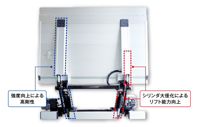シリンダの大径化をはじめとするリフトメカの性能を向上させるとともに、リフトアームやプラットホーム、スチフナ等の強度を向上させ、重量物荷役に対応する高い剛性を実現しました。ハードな作業もタフに対応します。