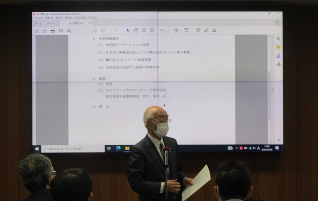 山形県米沢市(市長 中川勝)は、令和5年3月3日(金)に「Society5.0実現に向けた米沢市ICT推進チーム最終報告会」を開催しました。米沢市ICT推進チームは、令和2年3月にNECパーソナルコンピュータ株式会社(本社:東京都千代田区 代表取締役執行役員社長及びレノボ・ジャパン代表取締役社長:檜山太郎、以下NECPCという。)と締結した連携協定のもと、地域の課題解決にデジタルを活用した手法を検討するチームとして、市役所の若手職員24人が組織横断的に結成され、NECPCがアドバイザーを担いながら4チームに分かれ、それぞれのテーマで3年間の活動を行ってきました。その最終報告として中川市長をはじめ関係部署の幹部職員へ事業報告を行いました。