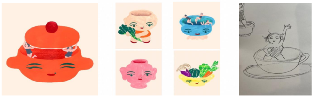作品は、益子焼をモチーフにした愛らしいキャラクター「ぽっとちゃん」やシシガールに、益子町特産のいちごや新鮮な野菜が、シシヤマザキ氏の特徴的なタッチで描かれています。